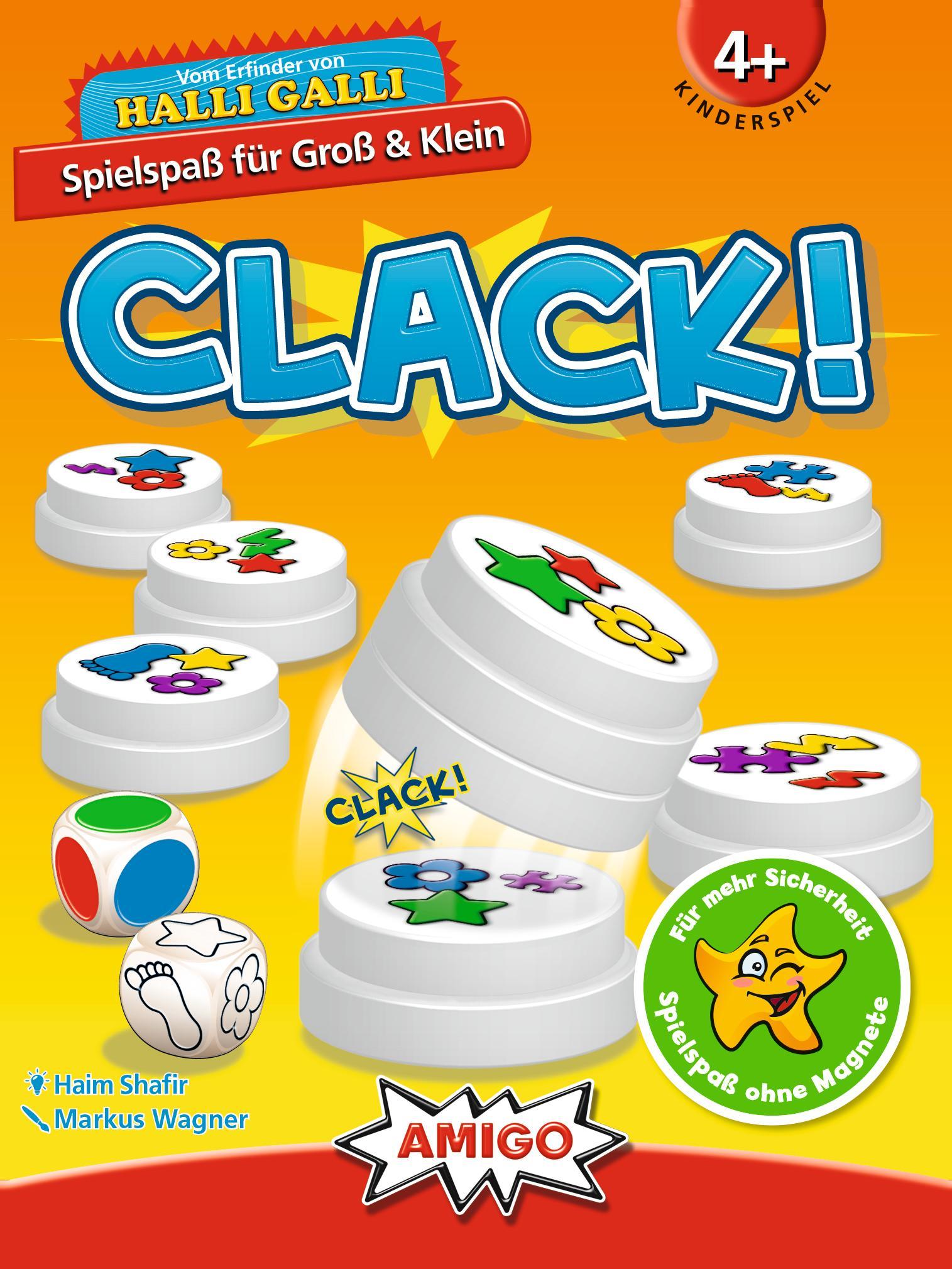 Clack! RefreshBei Clack! spielen immer alle Spielenden gleichzeitig: Es wird gewürfelt und schon greifen alle nach den bunten Scheiben. Denn die Würfel geben Form und Farbe der Symbole vor, die auf den Scheiben zu sehen sein müssen. Schnell werden die richtigen Scheiben aneinander geklackt und wer am Schluss den höchsten Scheibenturm hat, gewinnt. Auf die Plätze, fertig, ?Clack!?.So spielt man Clack! Refresh: Verteilt alle Scheiben so auf dem Tisch, dass die farbigen Symbole zu sehen sind. Ihr würfelt mit beiden Würfeln, danach spielt ihr alle gleichzeitig. Greift mit einer Hand so schnell wie möglich alle Scheiben mit dem gewürfelten Symbol in der gewürfelten Farbe, bis keine passenden Scheiben zu finden sind. Die Scheiben klacken dabei aneinander. Danach würfelt ihr die beiden Würfel neu und greift von den verbliebenen Scheiben diejenigen, die zum neuen Würfelergebnis passen. Wird eine weiße Würfelseite gewürfelt, müsst ihr nur auf das achten, was auf dem anderen Würfel zu sehen ist. Werden beide weißen Würfelseiten gewürfelt, müsst ihr weder auf die Farbe noch auf das Symbol achten. Greift so schnell wie möglich nach allen Scheiben. Habt ihr alle Scheiben genommen, endet das Spiel. Wer den höchsten Stapel hat, gewinnt.Inhalt:*40 Spielscheiben*2 Sonderwürfel*1 SpielanleitungMaße: 17,1 x 12,8 x 5,6 cmAutor: Haim ShafirGrafik: Markus WagnerErfolgsfaktoren:*Außergewöhnliches Spielmaterial*Kurze Regeln, schnelle Spieldauer, mega Spielspaß!*Von Erfolgsautor Haim Shafir (Halli Galli)*Action am Spieltisch für Groß & KleinAuf der Empfehlungsliste "Kinderspiel des Jahres 2012", Kinderspiel des Jahres 2012 in Finnland