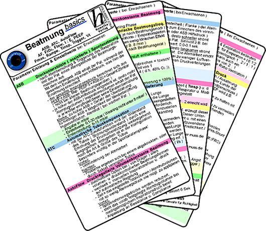Beatmung basics ( 2 Karten-Set ) ASB, ATC, AutoFlow, AF, FiO2, Flow, I:E, PEEP, Pmax, Rampe, Tinsp, Trigger, Vt (2er Set)Ideal zum "schnellen" Nachschlagen der wichtigsten Beatmungs-Parameter!Details: ASB - Druckunterstützte ( assistierte ) Spontanatmung ATC - Automatische Tubuskompensation AutoFlow - Druckregulierte Volumenkonstante Beatmung f ( AF ) - Atemfrequenz / mandatorische Beatmungsfreq. FiO2 - Inspiratorische ( in der Einatemluft enthaltene ) Sauerstoffkonzentration Flow (V) - Fließgeschwindigkeit / Volumenlieferung pro Zeiteinheit I: E - Atemzeitverhältnis PEEP - Positive endexspiratorischer Druck Pmax - obere Luftdruckbegrenzung / oberes inspiratorisches Druckniveau Rampe - Druckanstiegszeit Tinsp - Dauer der Inspirationszeit Trigger - Drucktrigger / Flowtrigger Vt - Tidalvolumen ( Atemzugvolumen ) Größe DIN A6 laminiert und abwaschbar